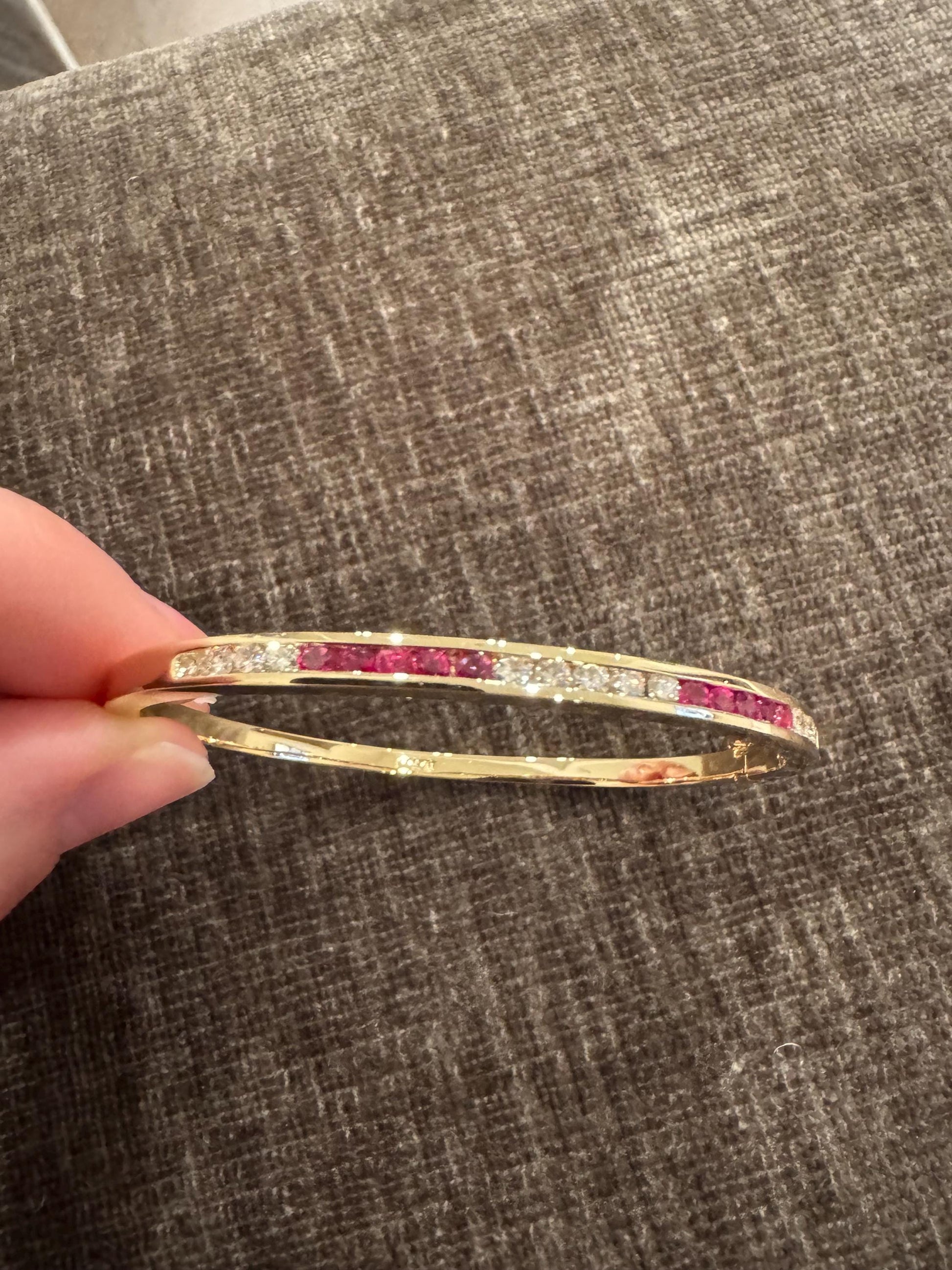 Add bold brilliance to your wrist stack with this stunning vintage ruby and diamond bangle. Crafted in solid 14K yellow gold and weighing 16.2 grams, this bracelet features 1.2 carats of natural red rubies and nearly a full carat of bright white round diamonds in a sleek channel setting. Elegant, substantial, and easy to wear, perfect for layering or solo styling.