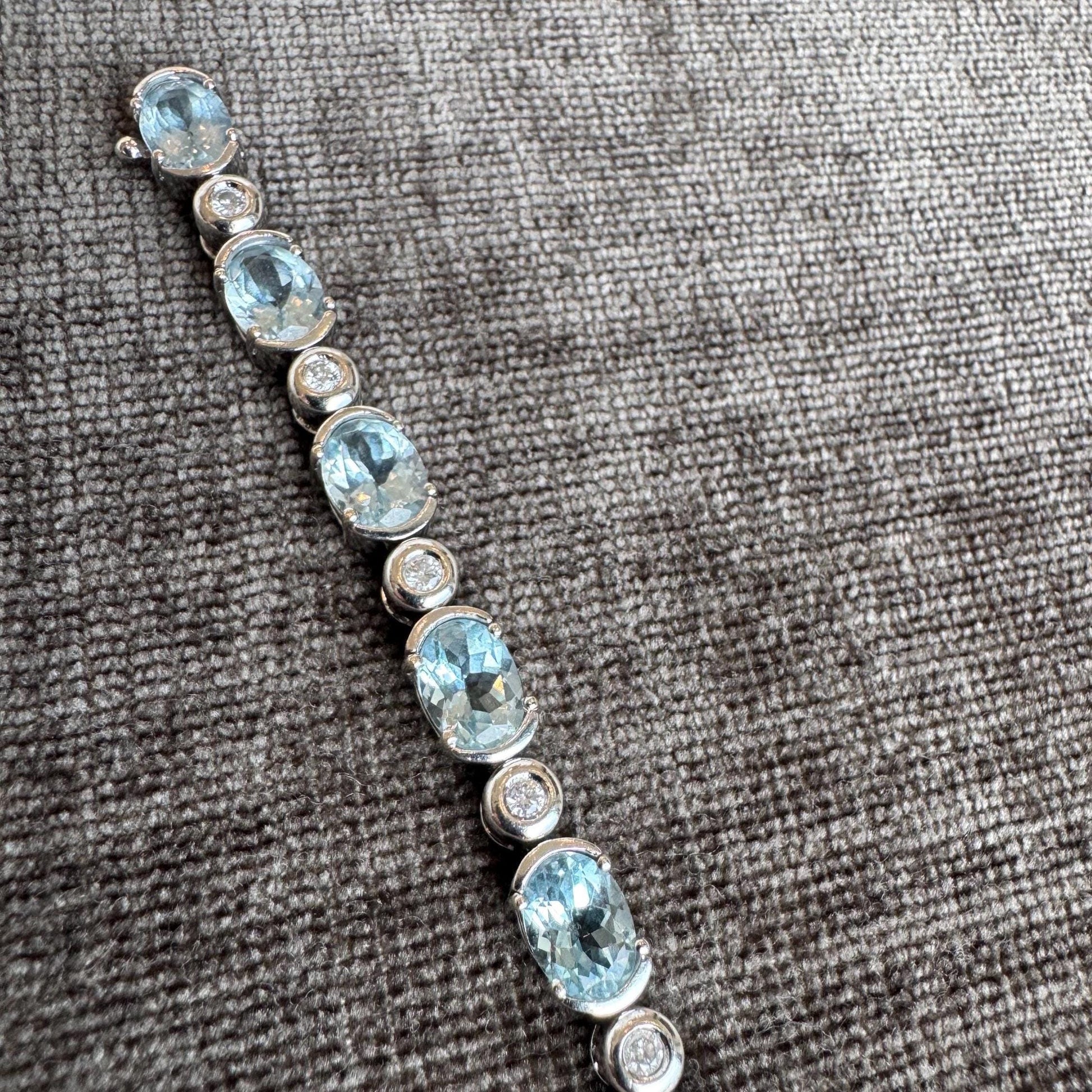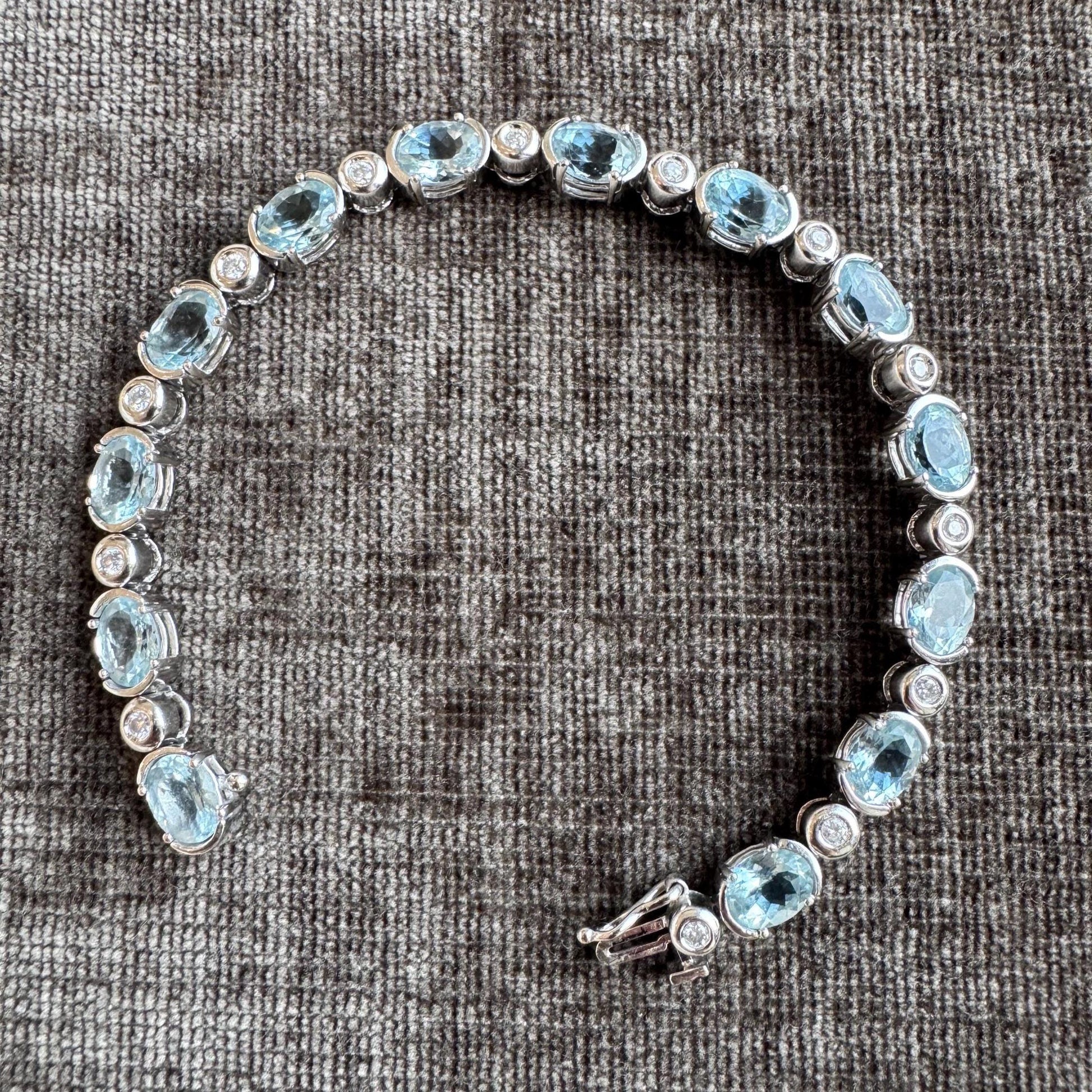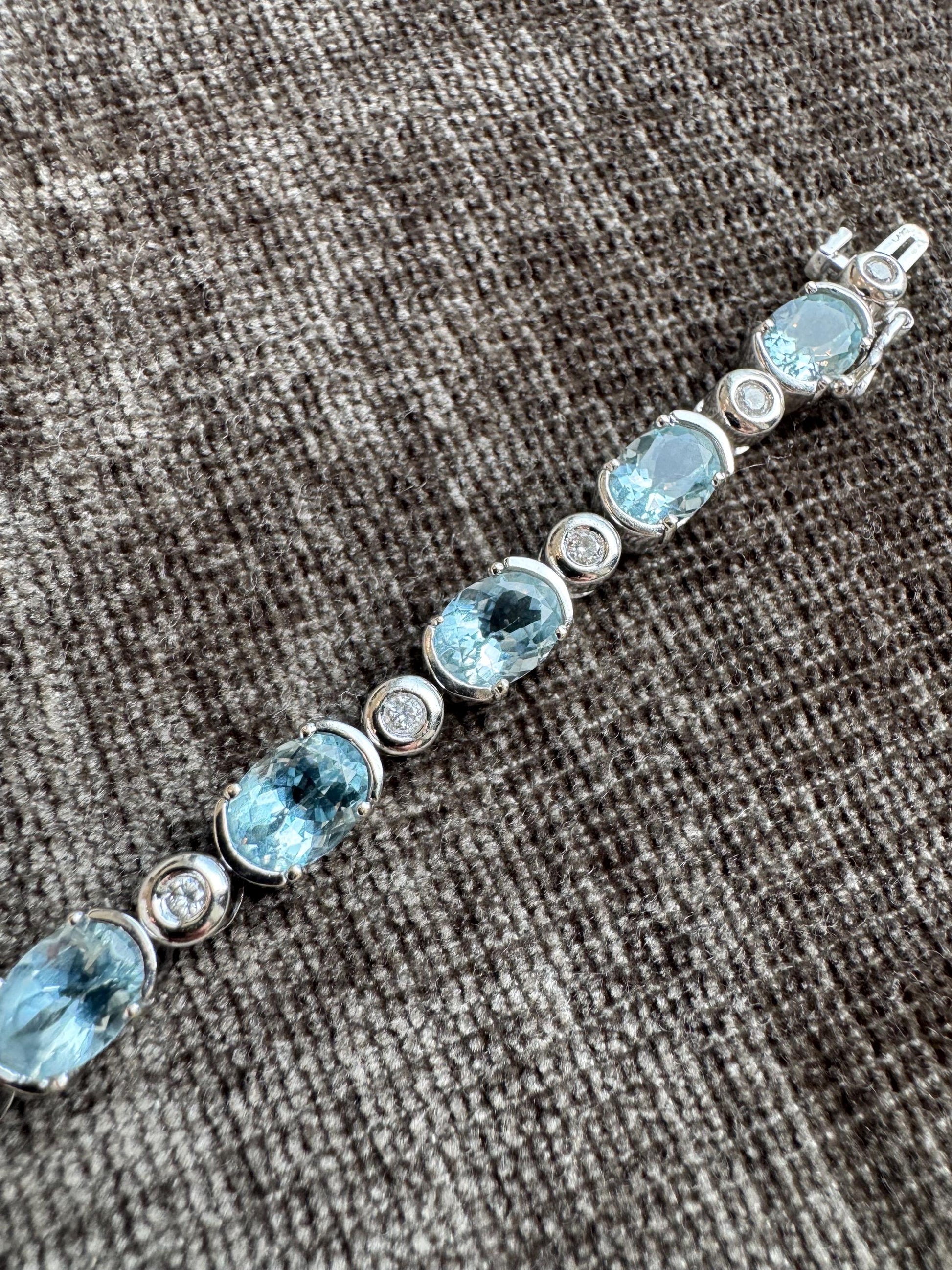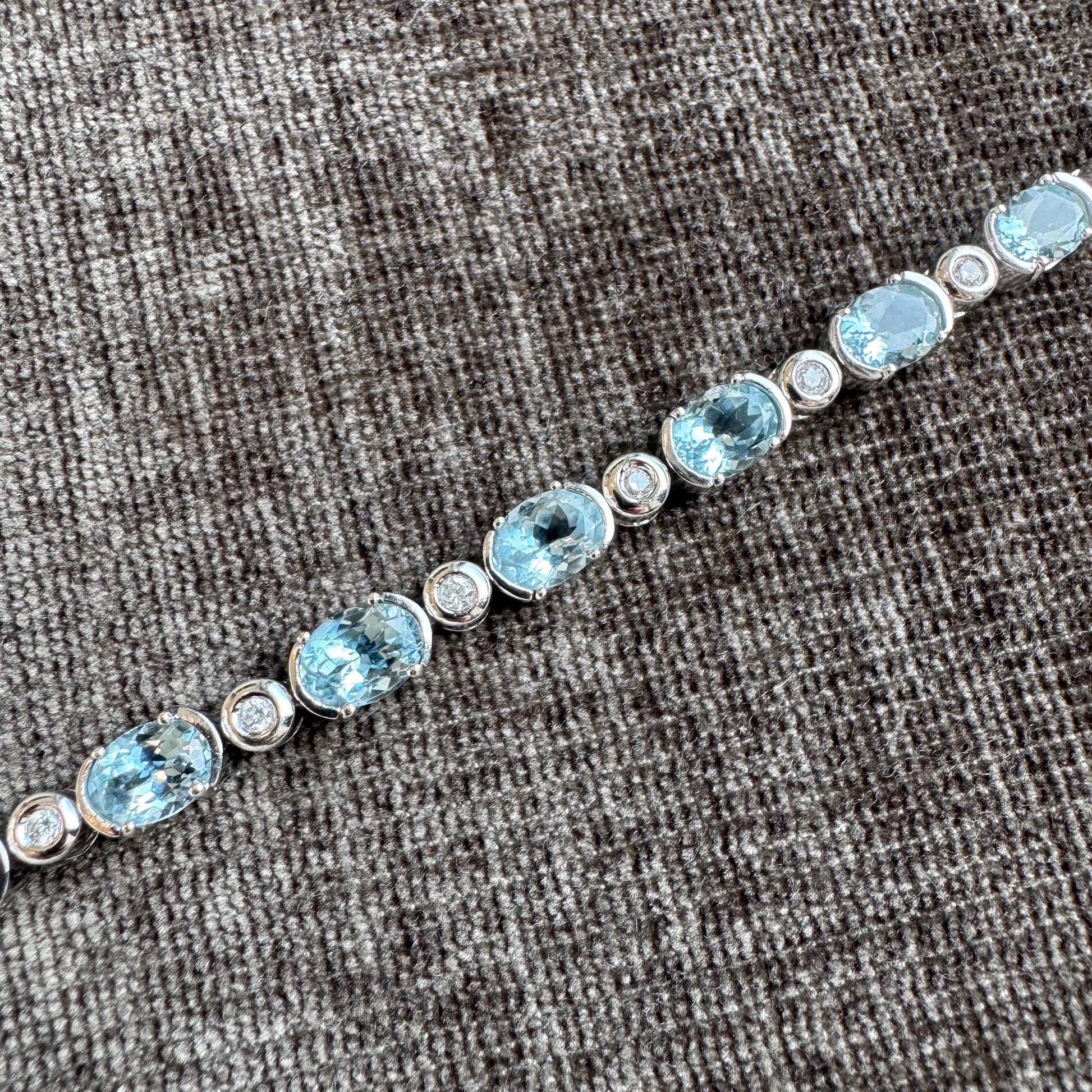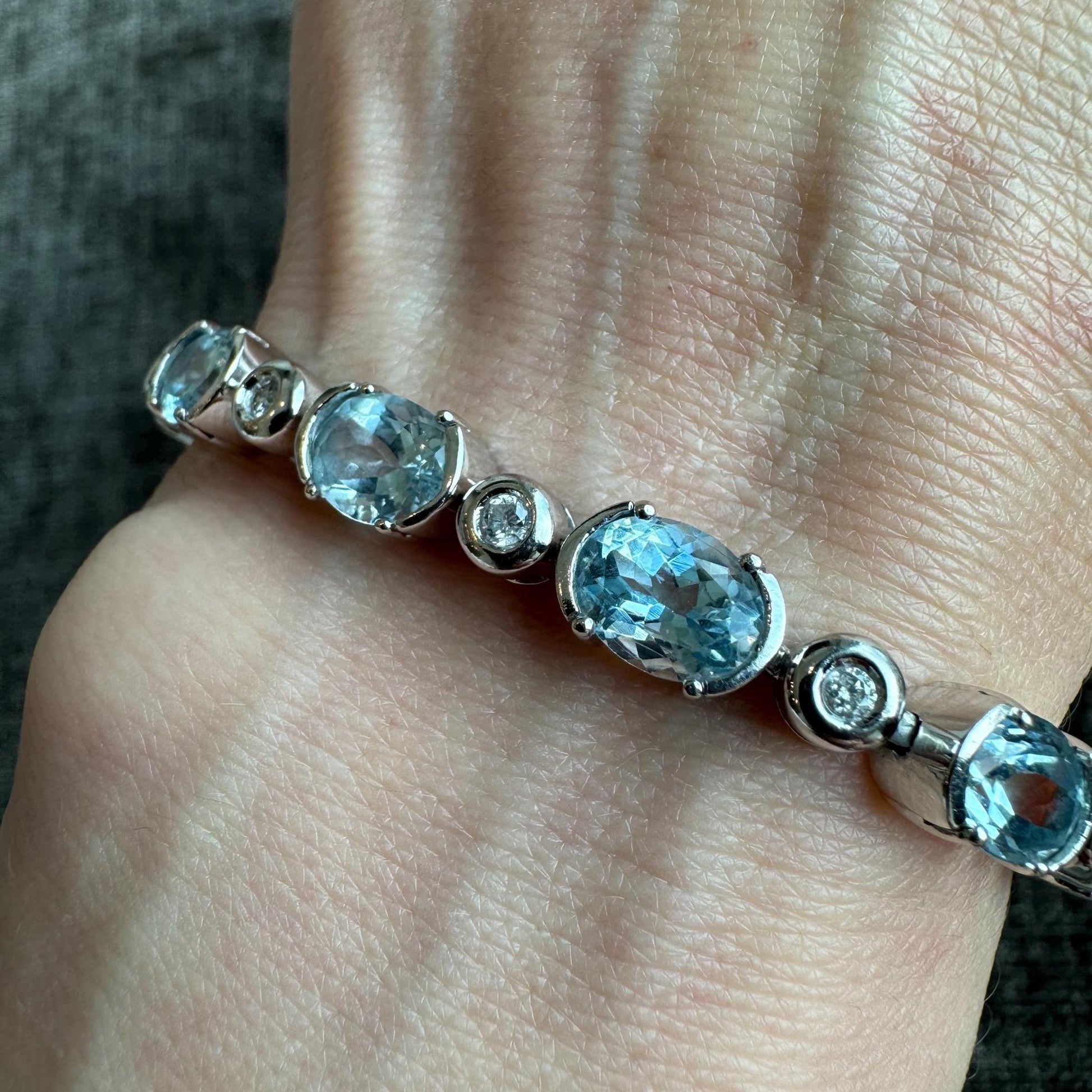 The cool blue tones of the aquamarines contrast perfectly with the sparkle of the diamonds, creating a sophisticated bracelet that transitions effortlessly from day to night. The stones are set in a solid and heavy white gold setting with a secure clasp and safety latch for peace of mind.