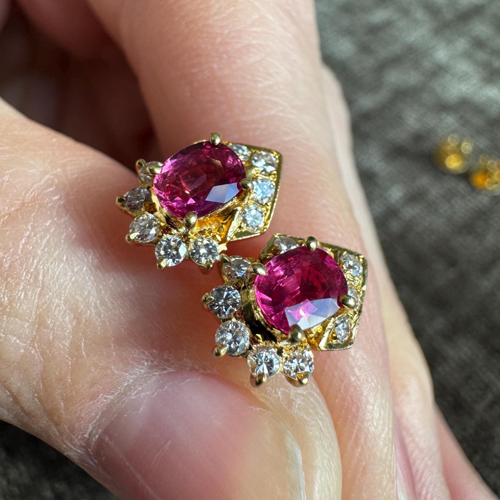 18k Natural Ruby & Diamond Earrings | Vintage Solid Gold Studs | Estate Fine Jewelry