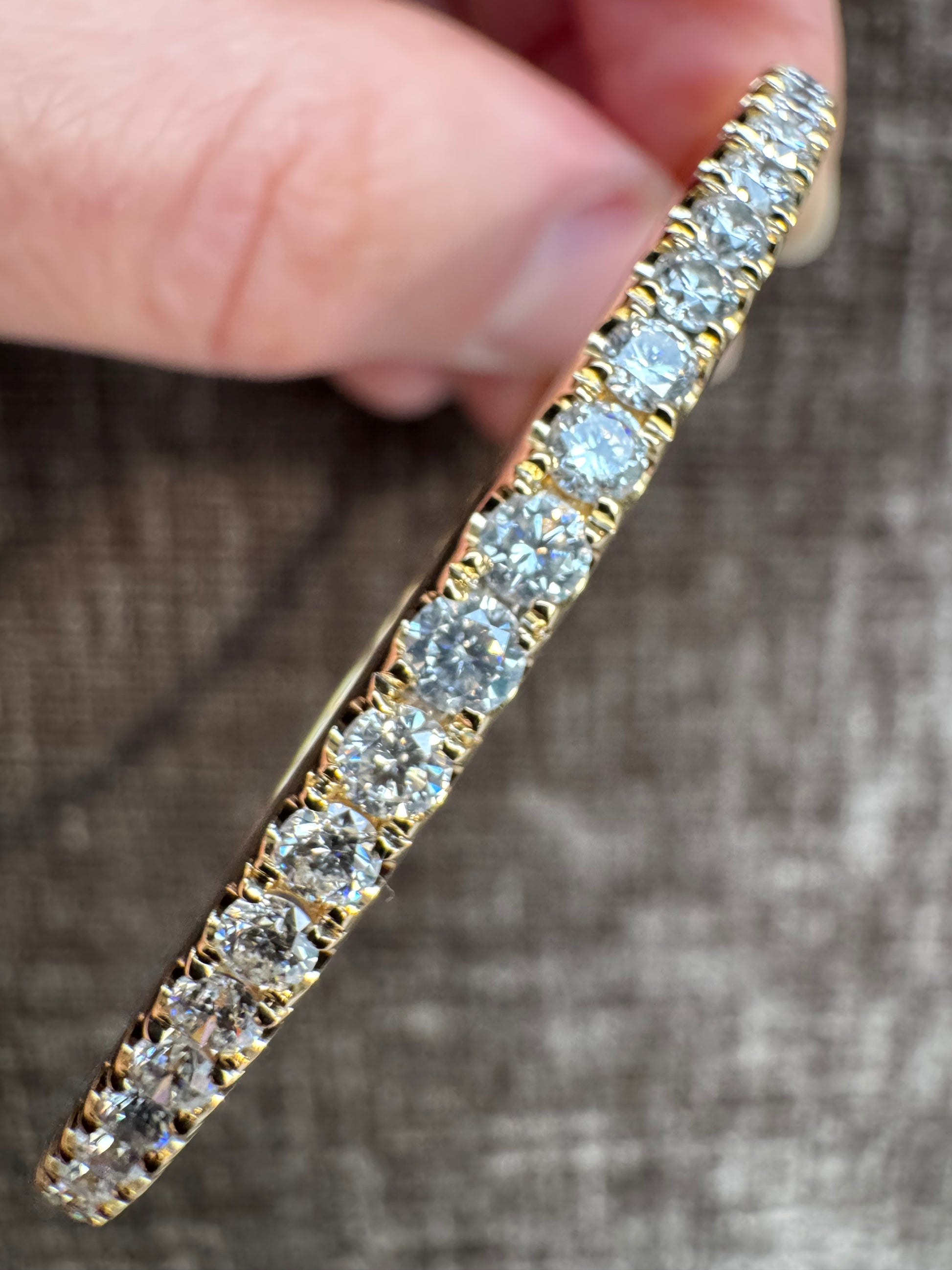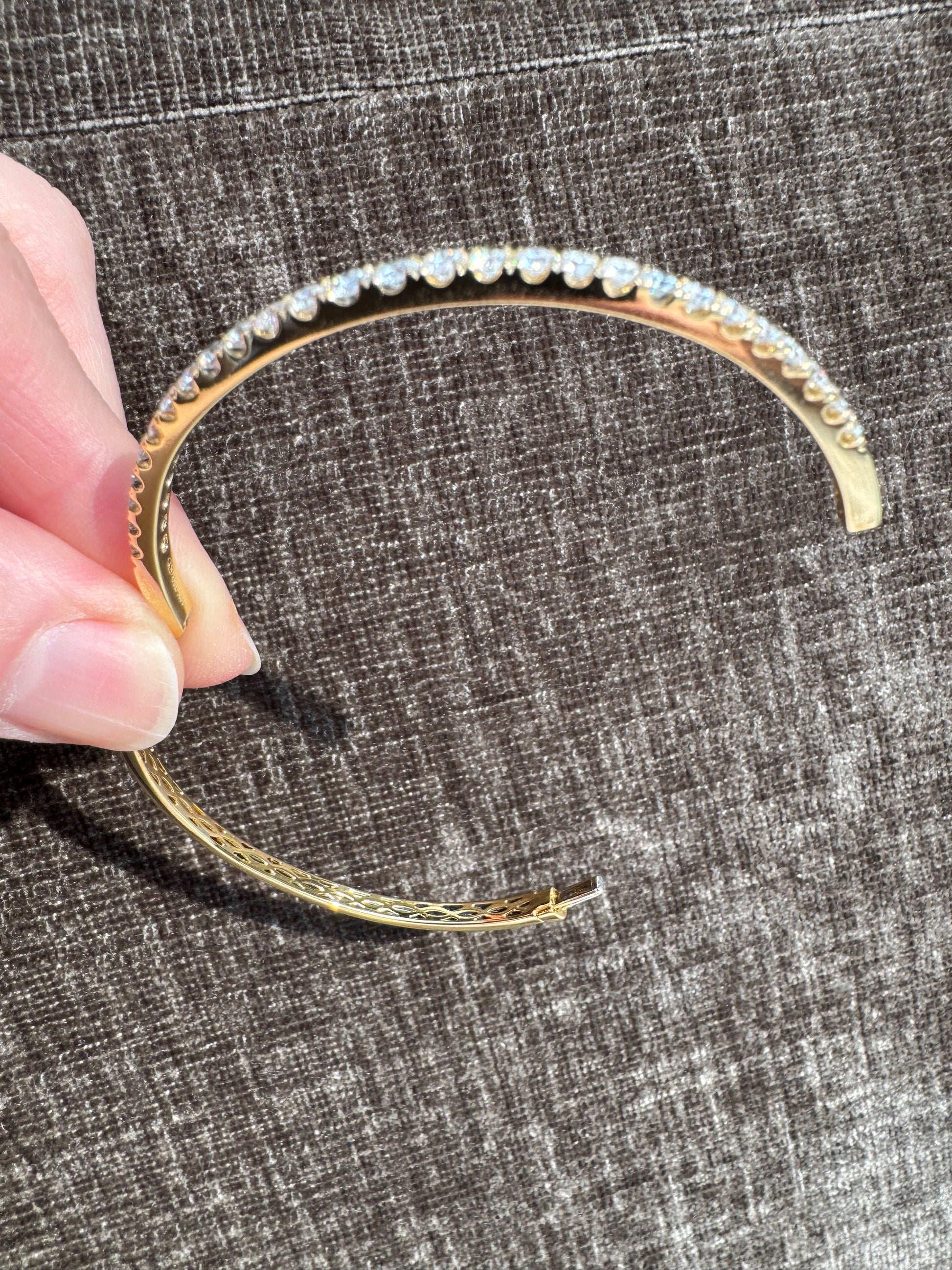 This luxurious 18k yellow gold diamond bangle is set with 27 natural round brilliant diamonds, graduating gracefully from bold brilliance at center to a fine shimmer at the ends. Estimated at ~2 to 2.50 carats total weight, this piece radiates timeless elegance and feels effortlessly elevated whether stacked or solo.