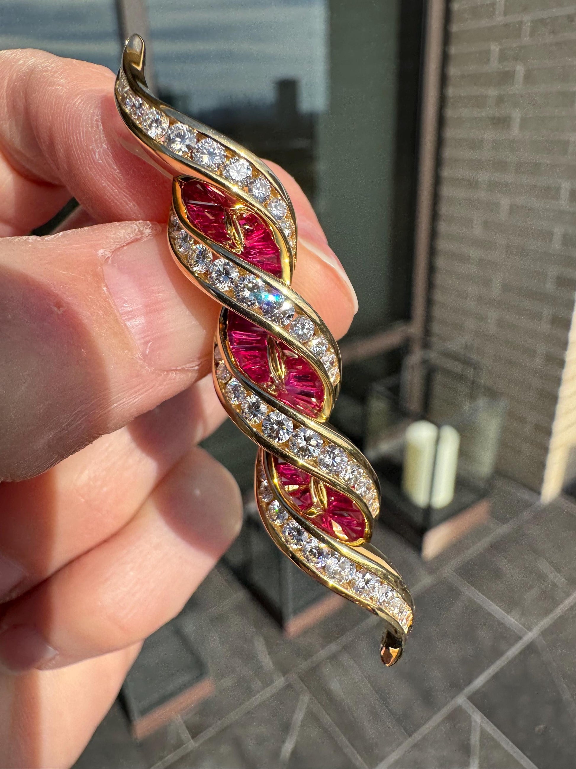 Make a bold and timeless statement with this exquisite vintage brooch by designer Krypeell. Crafted from rich 18K solid yellow gold, this signed swirl brooch showcases a stunning interplay of fiery natural rubies and sparkling round brilliant diamonds.