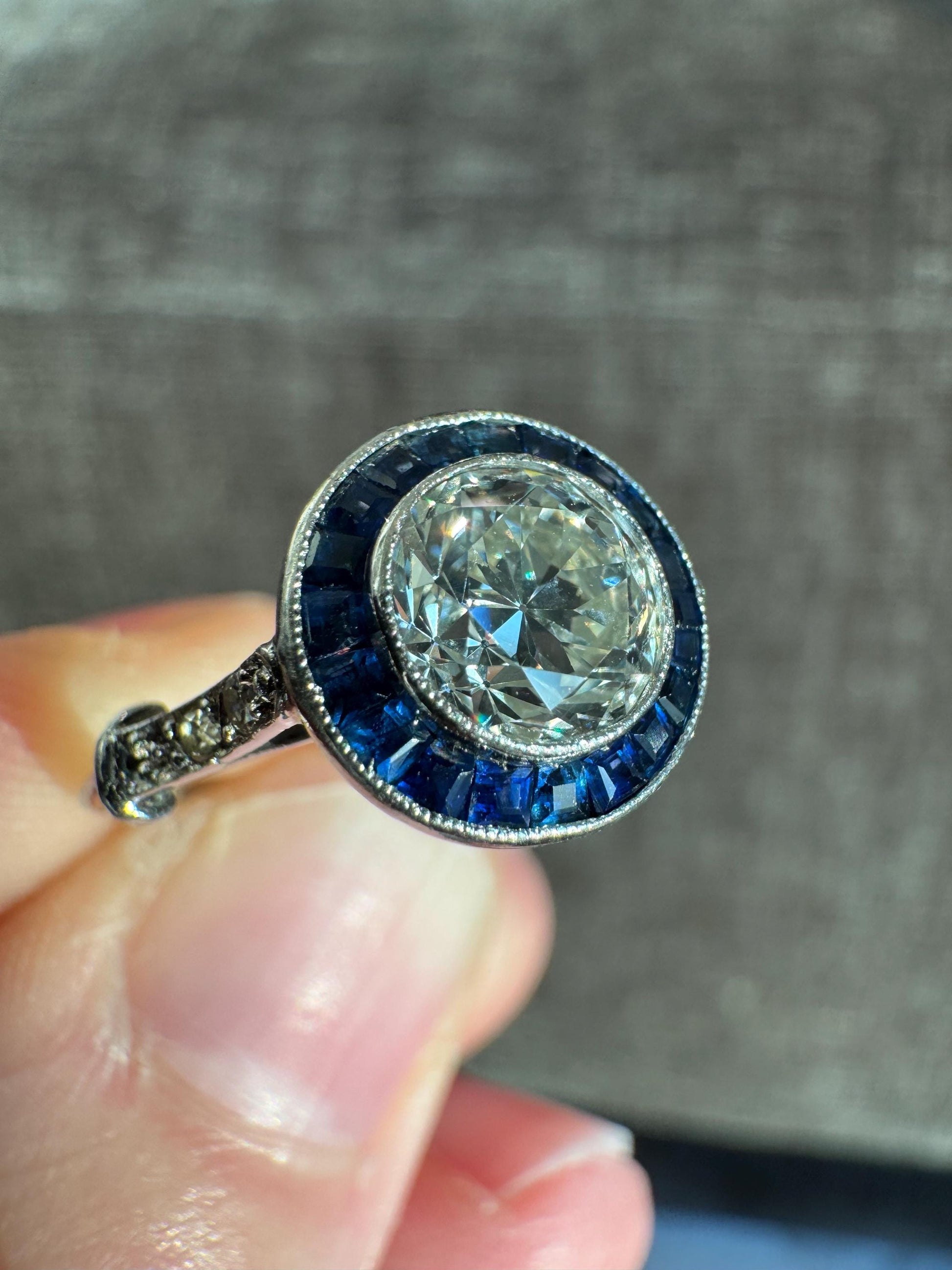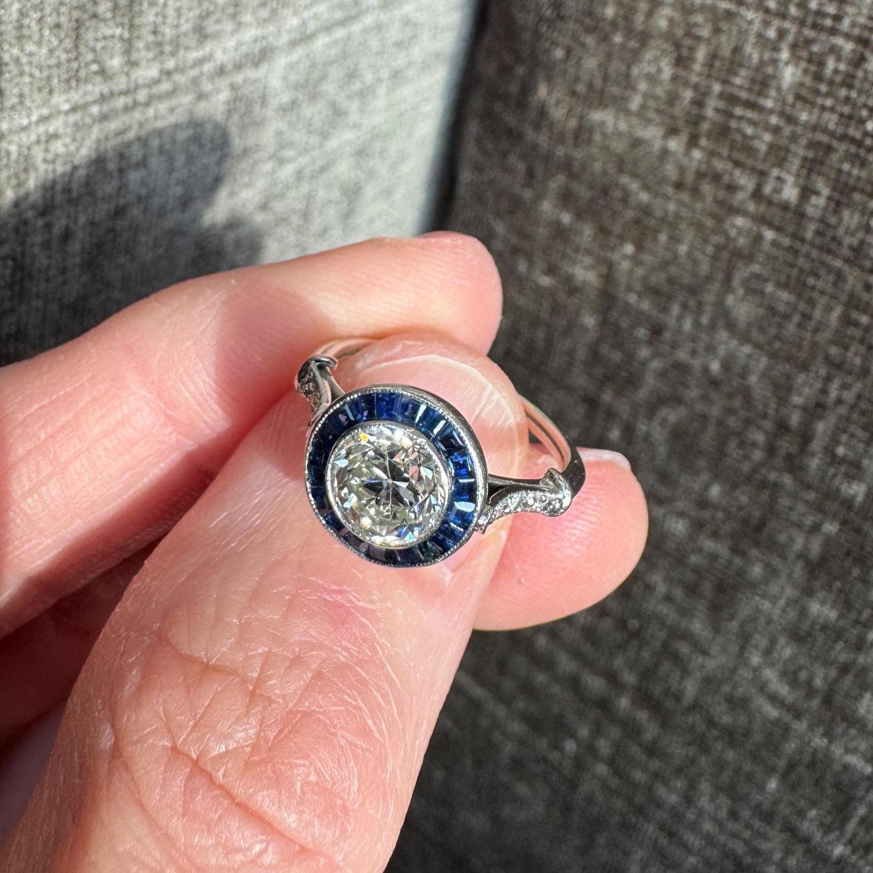 Art Deco Diamond Ring | 1.10ct Old Mine Cut, Sapphire Halo, Platinum, 1920s