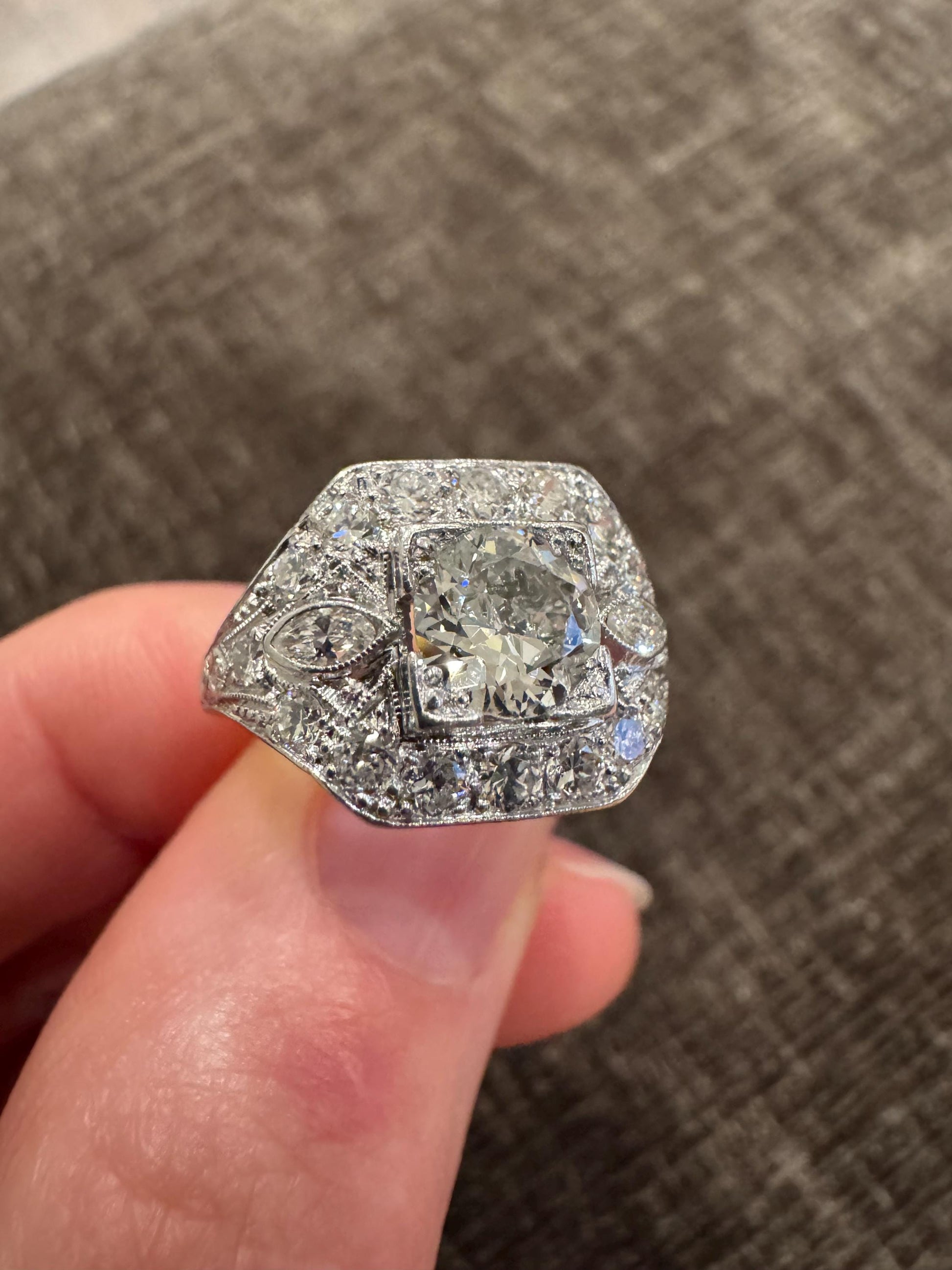 This exquisite platinum Art Deco ring is a true showstopper. Featuring a 1.15 carat old mine cut center diamond (I1 clarity, G color) and approximately 1.65 carats of sparkling accent diamonds in marquise and round cuts, this vintage treasure exudes 1920s glamour. 2.80 ctw.