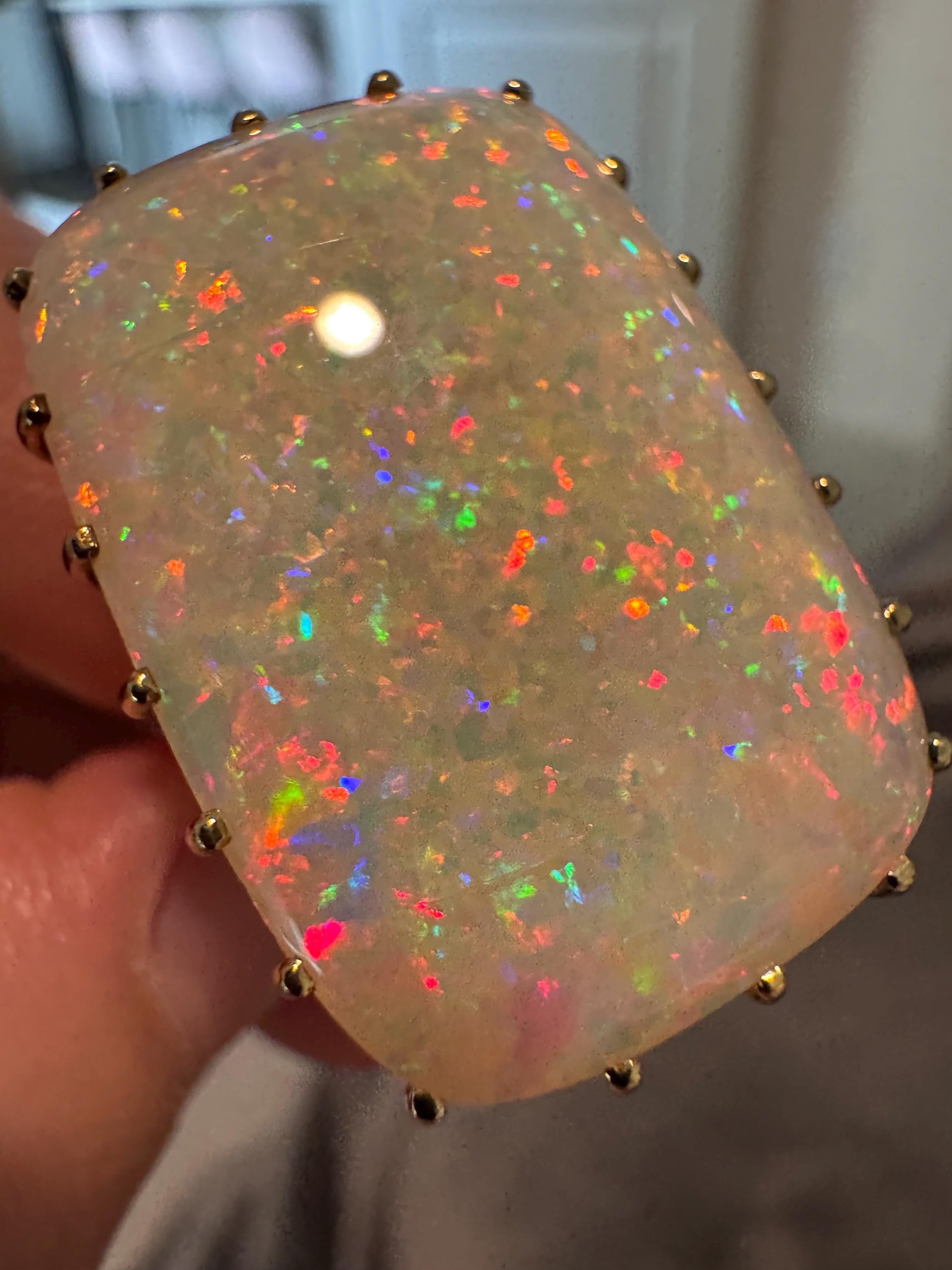 This vintage estate treasure features a jaw-dropping 24-carat genuine natural opal solitaire set in solid 14k yellow gold (stamped 585). The opal has been professionally appraised by a strict GIA Graduate Gemologist, confirming its authenticity and showcasing exceptional color across the entire stone — vibrant reds, blues, greens, and violets in a spectacular display of play-of-color.
