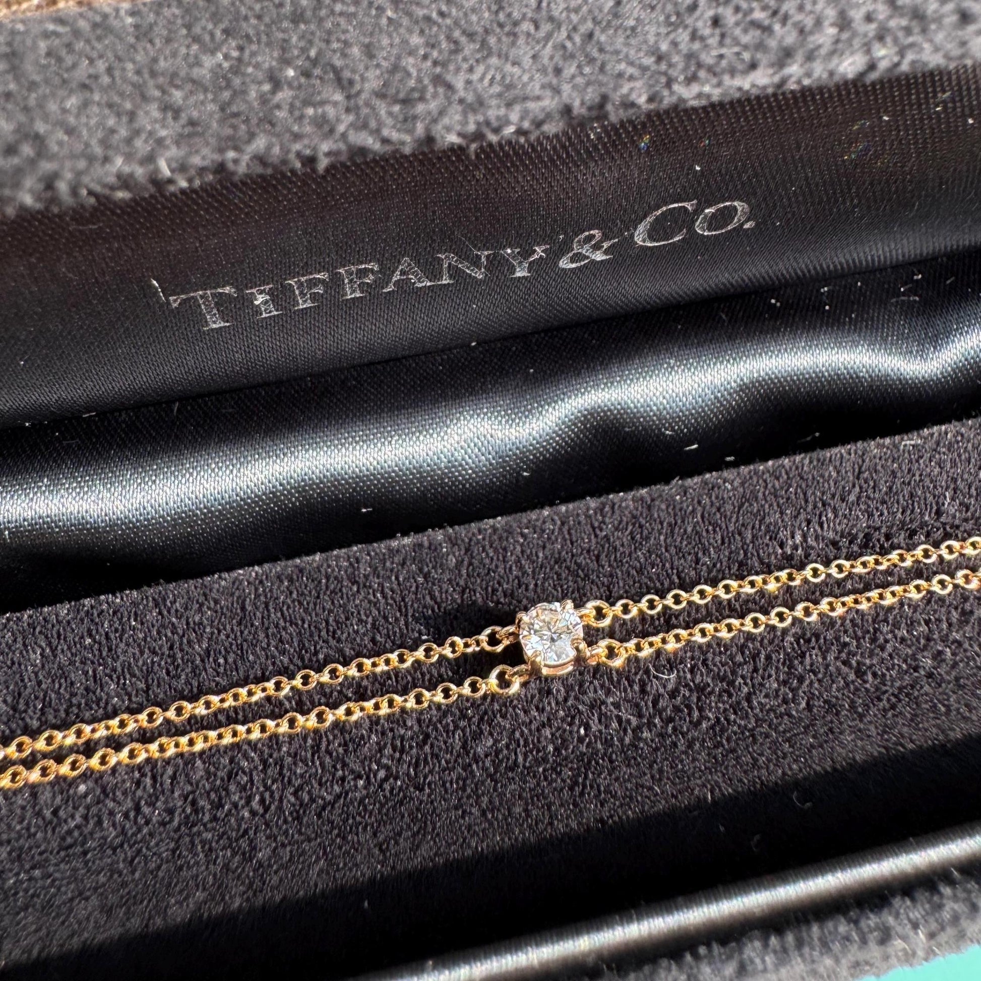 This delicate double-chain bracelet from Tiffany & Co. features a solitaire round brilliant diamond (0.18 carat total weight) centered on rich 18k rose gold. Itβs a minimalist, refined piece that pairs effortlessly with everyday wear or layers beautifully with other fine bracelets.