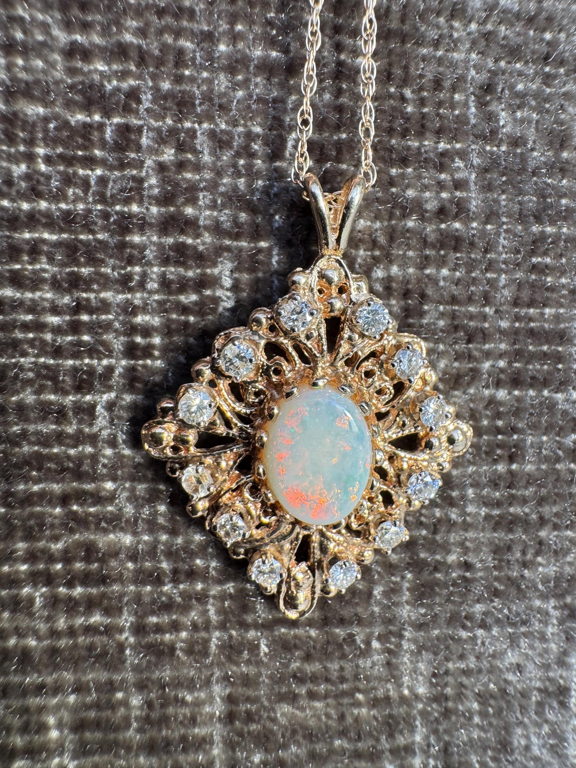 Vintage 14k Gold Opal & Diamond Pendant | Natural Opal Necklace | Fine Estate Jewelry