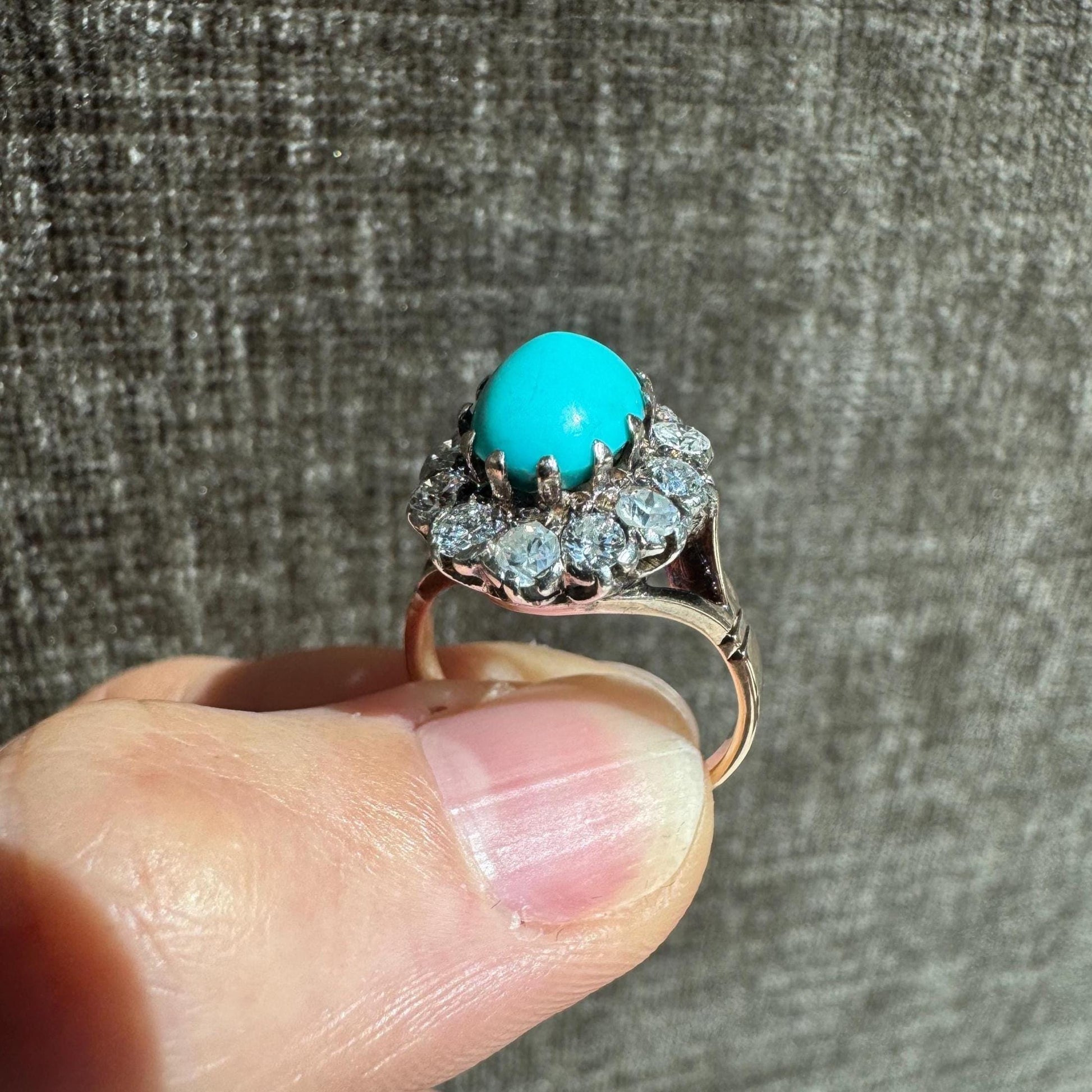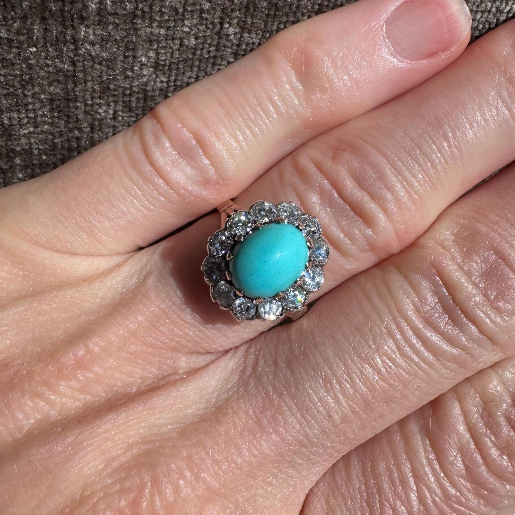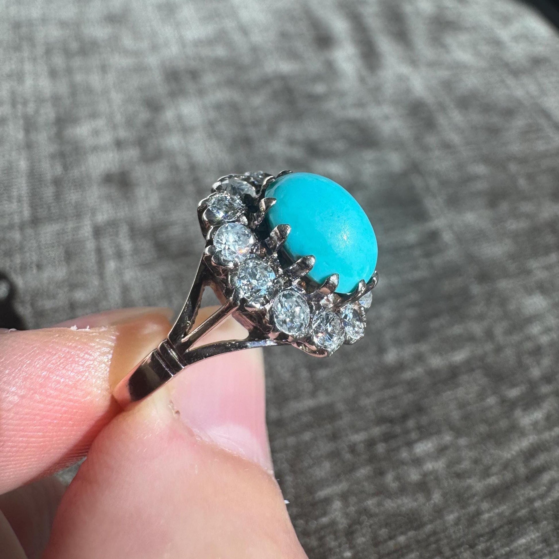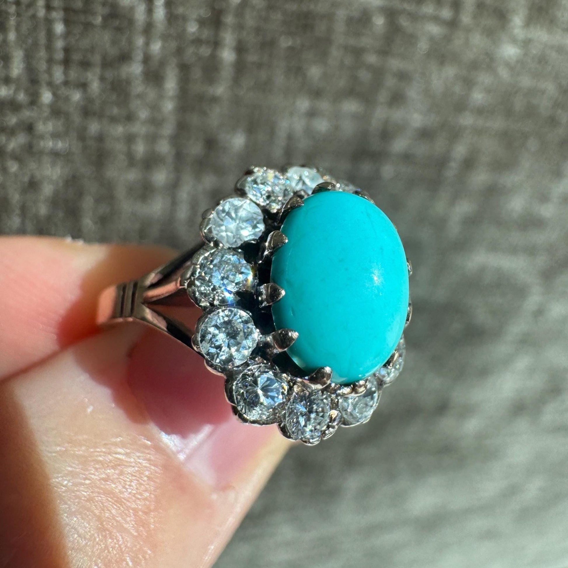 Vintage 14k Gold Turquoise Diamond Halo Ring: 1.5ctw, Size 6