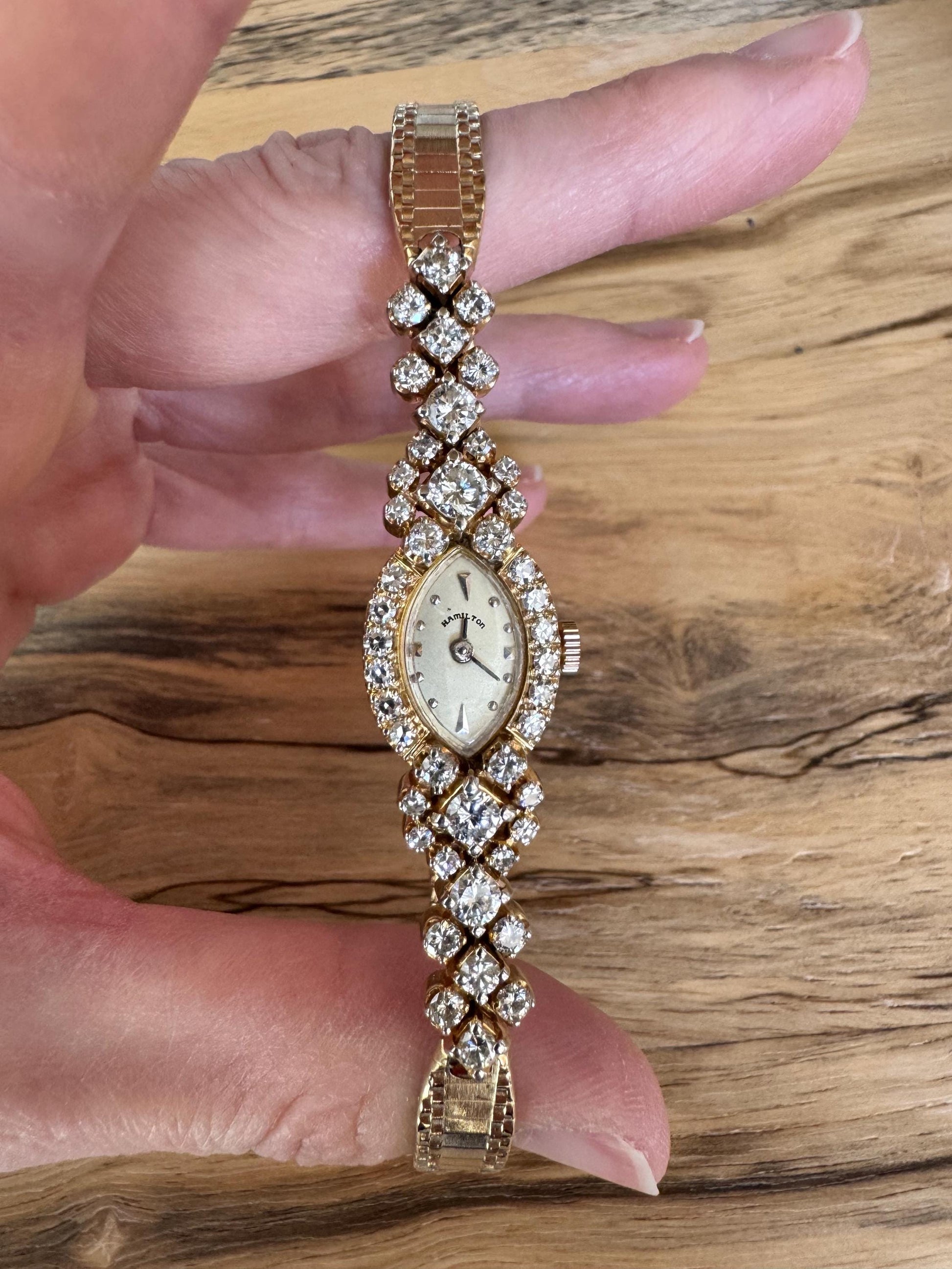 This vintage Hamilton ladies watch is crafted in solid 14 karat yellow gold and absolutely loaded with sparkle, featuring over 3 total carats of natural diamonds set throughout the case and bracelet. Every movement catches the light, making this piece feel far more like fine jewelry than a traditional timepiece.