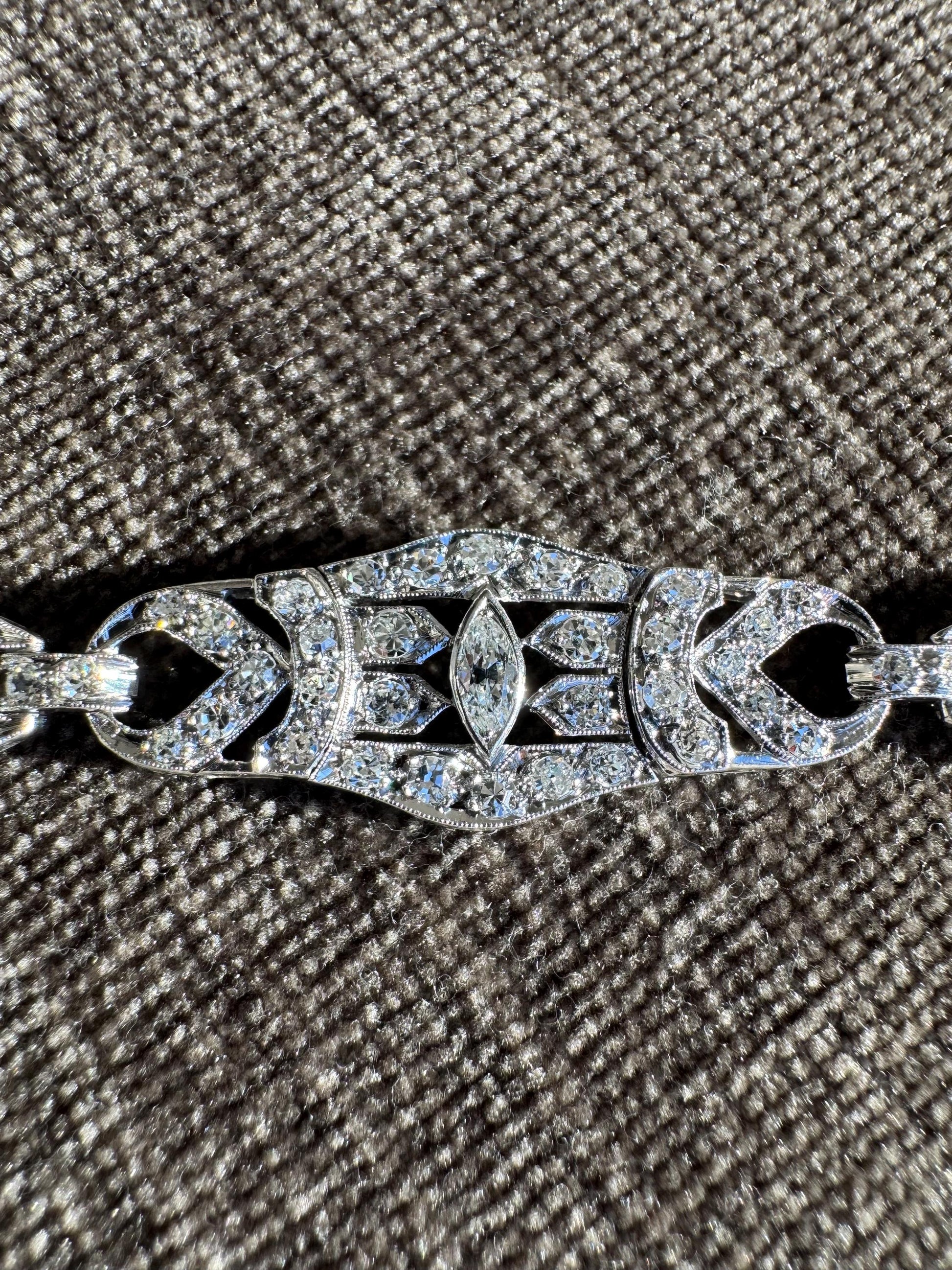 This exquisite vintage bracelet is a true Art Deco masterpiece—crafted in solid platinum with 77 natural diamonds, including one striking marquise-cut stone. With a total carat weight of approximately 1.86 ctw and beautifully graded stones (SI2–I1 clarity, H–I color), this piece shimmers with refined elegance and detailed craftsmanship.