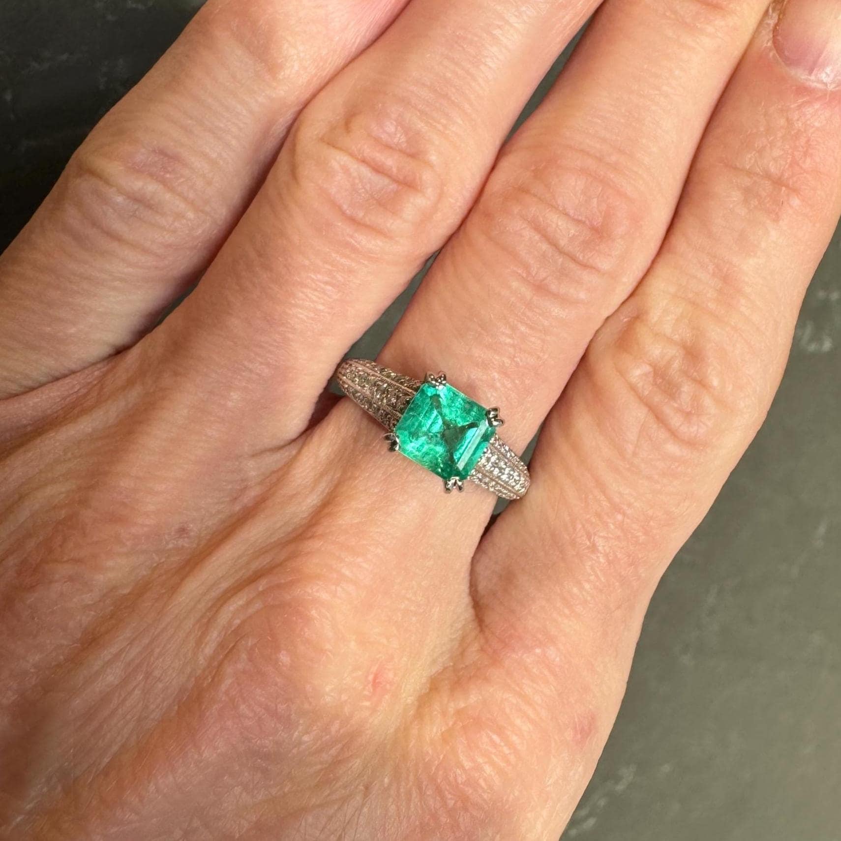 An exceptional vintage platinum ring featuring a natural Colombian emerald, estimated at approximately 2 carats, celebrated for its vivid green color and luminous presence.